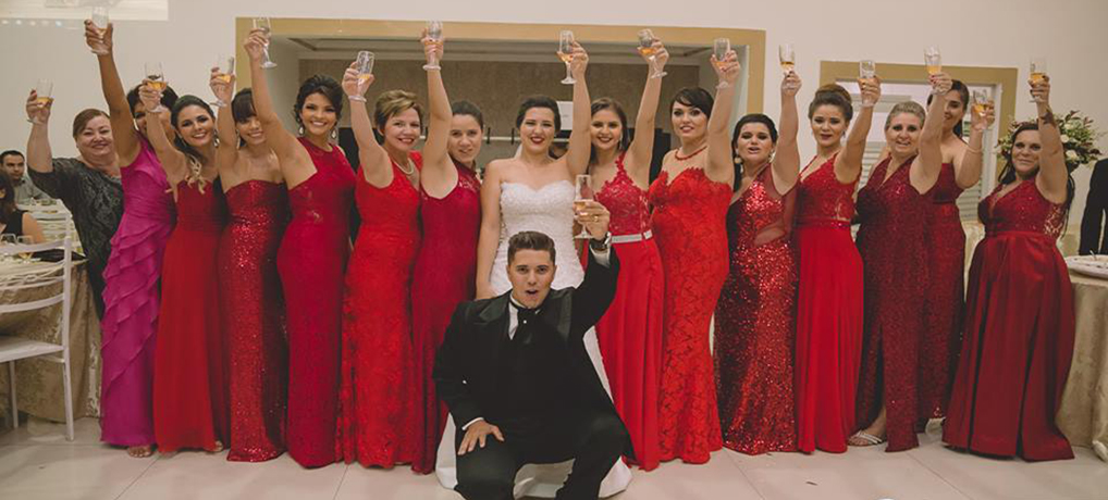Como ela prefere cores exuberantes e chamativas, optou pelo vermelho para a decoração e também para o seu time de madrinhas. Para a Thalyta, essa cor tem um significado muito especial: representa o amor e a paixão. Ela acrescentou flores brancas e se aproveitou do tom dourado que o salão já tinha (e do lustre luxuoso), para dar um tom de suavidade à festa.